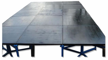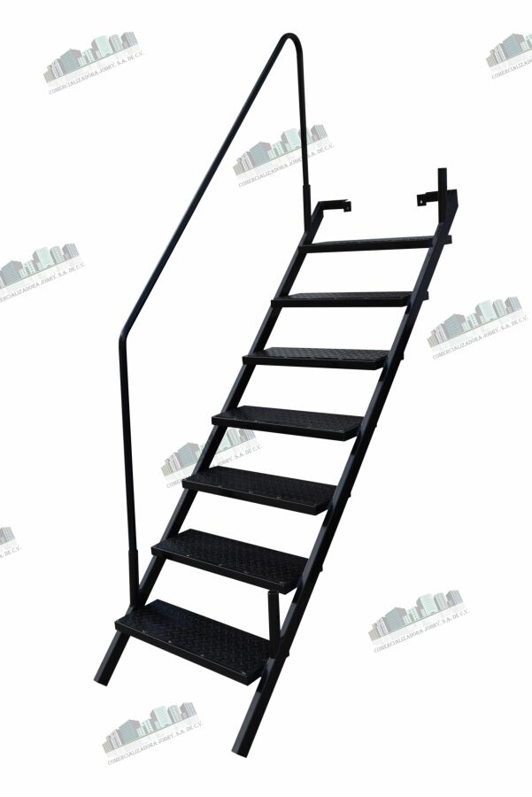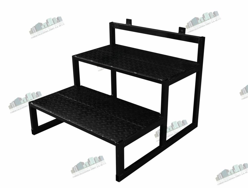 Superficie color negro, escalera metálica para acenso y descenso de personal, tela bambalina a los costados color negro, soporta una carga de 200kg. X m2.