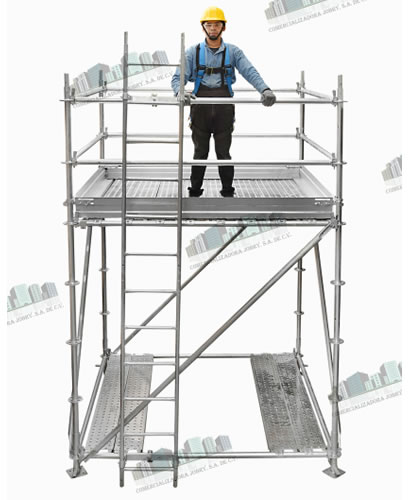 Torre de Andamios Multidireccional ( ROSETA) de 2m Altura + 1m de Barandal de seguridad, 1 Nivel de Plataforma, 1 Escalera Marina.